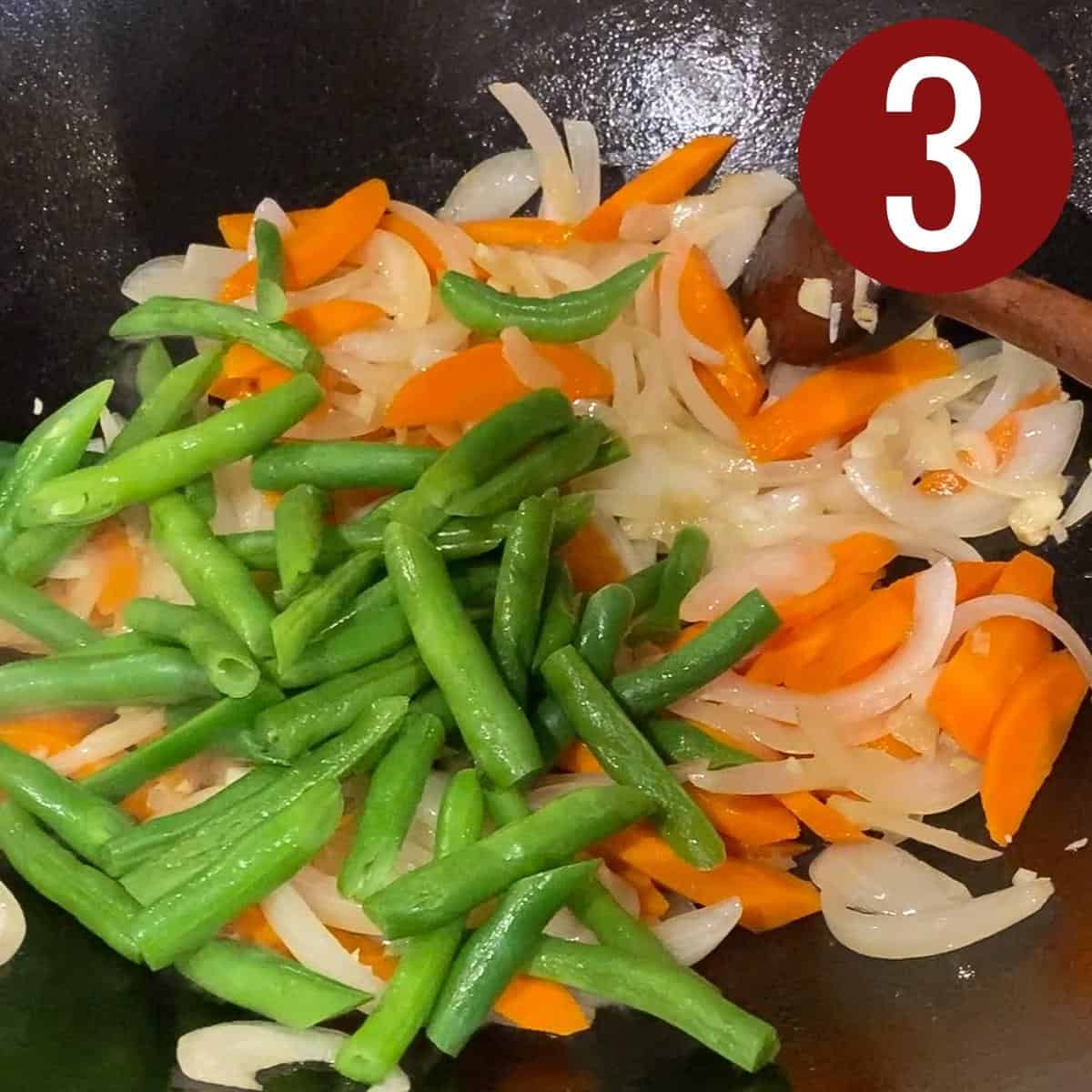 Step 3: Add the green beans to the skillet and sauté with the rest of the ingredients. Stir fry for about 2 minutes.