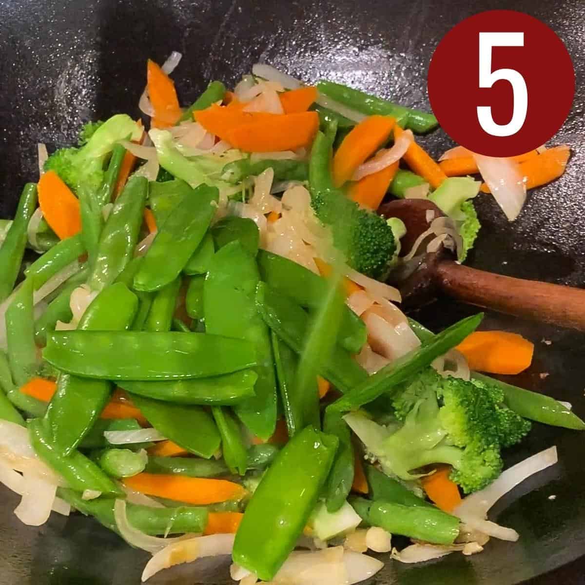 Step 5: Add the pea pods to the skillet and sauté with the rest of the ingredients. Stir fry for about 2 minutes.